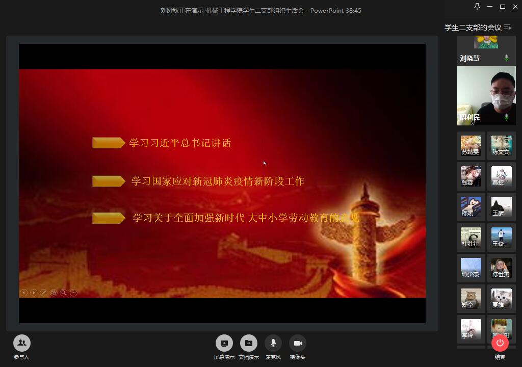 首先,由支部书记周利民介绍此次党组织生活会的主题并宣布学习活动开始。支部党员刘娅秋以PPT的形式带领大家开始了以“共抗疫情,爱国力行”为主题的学习,分别从三个板块加深我们对日前国家疫情形势的认识以及对劳动教育的认识:学习习近平书记讲话、学习国家应对新冠肺炎疫情新阶段工作、学习关于全面加强新时代大中小学劳动教育的意见。通过学习,我们意识到脱贫攻坚战不是一场轻松的战役 ,其作始也简,其将毕也巨,脱贫攻坚越到最后越要加强和改善党的领导;携手抗疫,共克时艰,我们应该正确认识新冠肺炎在全球的形势,全面加强国际合作,凝聚力量,携手同行,坚信人类命运共同体,才能赢得这场重大传染疾病的斗争。随后,支部党员夏雄等三位同志发表了此次学习体会,指出作为一名党员,应该坚信国家和党的决策的正确性,发挥党员先锋模范作用;作为一名学生,在这个艰难的时期,应该不忘初心,牢记学生的使命和任务,不落下一堂网课,不拖欠一次作业,在家也要好好学!