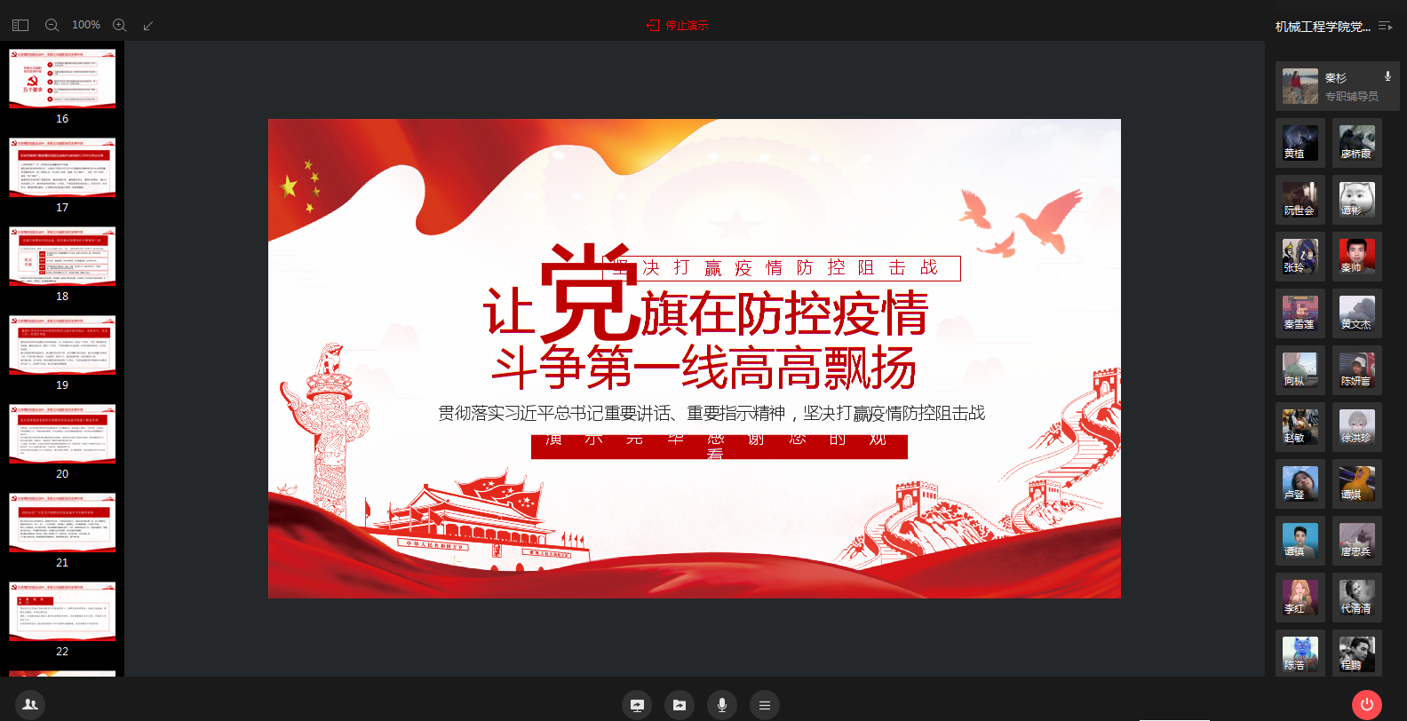 2020.6.29日,必赢线路检测3003no1党总支学生一支部开展了“让党旗在防控疫情斗争第一线高高飘扬”为主题的微党课活动,支部书记秦杉老师担任主讲人,支部34名党员参会。