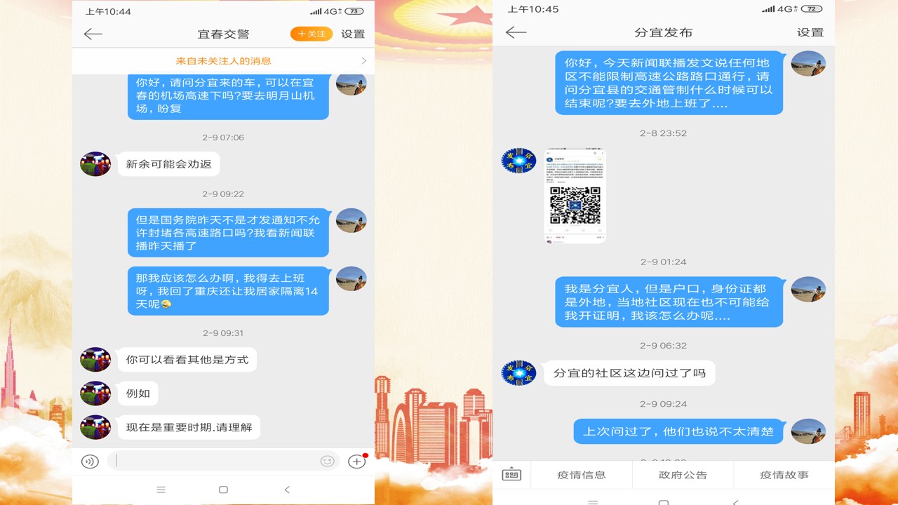 2月初,学校官方微信发通知教职工2月15日前返渝。我马上打开购票软件购买了2月11日返回重庆的机票。但是面对城区的交通管制,怎样到达机场成了最大的问题。而且当时我的家乡新余市作为江西省重点疫区,临近的城市都禁止新余车牌的车辆进入本地城区。我不停的电话、网络咨询相关部门,得到的都是否定或者不确定的答复。直到出行的当天,我都不知道我是否能够顺利回到重庆。2月11日那天下了非常大的雨,我们一家三口穿着雨衣,带着口罩,我背着孩子,从家里步行到县城的高速路口,等待着开宜春车牌的亲戚,来高速路口接我们前往宜春明月山机场。上车后,我们防疫措施都丝毫不敢松懈,和孩子在全程都带着口罩坐在后排,生怕在路途中感染病毒给亲人的健康带来威胁。