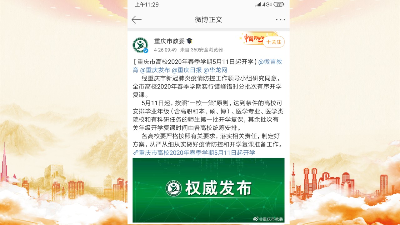 回到重庆后,虽然校历并未开学,但是工作的内容逐渐多了起来。统计与更新学生的居住地址、教委疫情系统的每日上报,答复学生各种关于开学的疑虑,以及部分问题学生由于居家时间太久,亲子关系已经出现了严重的问题,需要辅导员进行心理疏导与转介心理咨询中心。就在各种琐碎的工作进行中,4月底市教委终于发布了返校通知。在传达学校分批返校政策的同时,作为辅导员,需要不停的给同学们宣传防疫知识,关注学生的返校路线,避开重点疫区,将学校的实时更新的各项政策以同学们能够接受的方式传达给学生。在4月27日,我迎来了首批湖北返校的学生。同学们都很配合的遵守学校关于湖北的健康管理政策,每日通过企业微信与我沟通自己的身体状况,我也通过聊天侧面每天了解同学们的心理状态,确保同学们的身心健康。我不禁感叹,在这场战役中,每一位公民都在尽自己的责任与力量配合防疫工作,帮助社会回归正常的秩序。