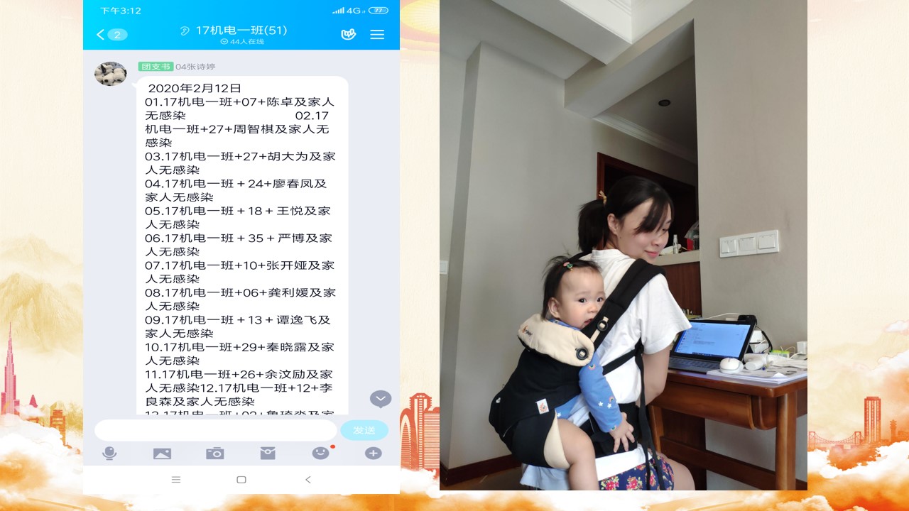 我和爱人作为高校辅导员,也同时作为学校的一名心理工作者,在今年2月就参加了教育部思政司开展的“关于高校肺炎疫情心理援助热线”的线上培训,开始了针对学生的线上的心理咨询工作。当时我们刚回老家,孩子很不适应,也很认生,每天都只要妈妈抱着,我就这样抱着孩子和爱人一起看完了所有直播培训课程。