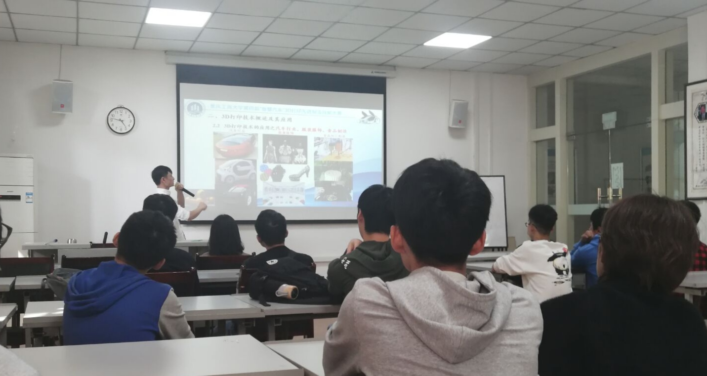 宣讲会前同学们参观了3D打印设备以及相关作品。宣讲会上吴老师介绍了3D打印工艺、3D打印相应技术管理以及在医疗、建筑等领域的应用,让同学们对3D打印技术有了初步了解。之后,吴老师对往届3D打印比赛主题及作品进行介绍,同时详细介绍了今年3D打印比赛的主题、比赛形式、评定方式。最后,又强调了绘图、建模等细节问题,给了同学们一些建议和鼓励。