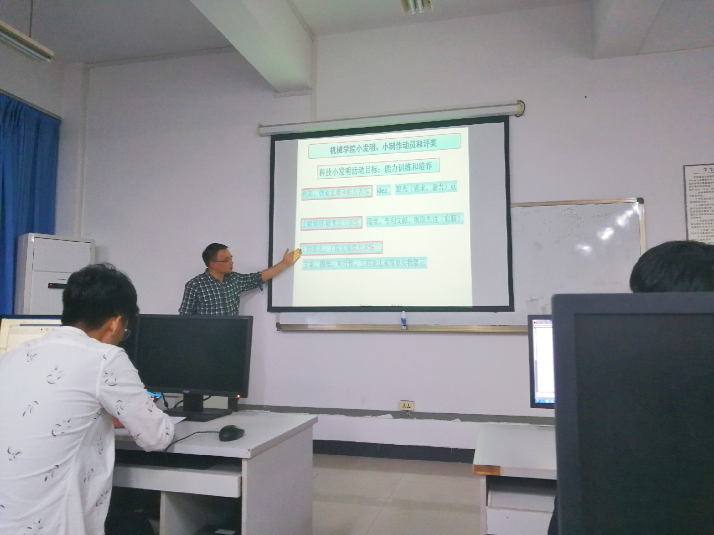 2019年10月18日晚,必赢线路检测3003no1在10209教室举行了小发明小创作比赛宣讲会,主讲为机电系副主任杨洪老师。