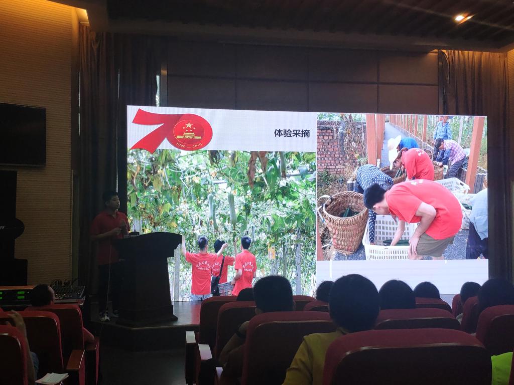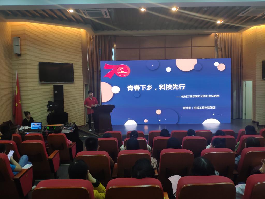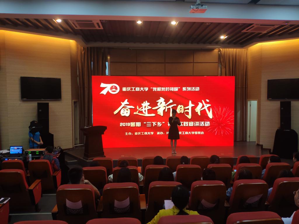 2019年10月11 日14:;00,学校在兰花湖片区MBA报告厅开展了“奋进新时代”2019暑期“三下乡”社会实践宣讲活动,展现了我校优秀学子在 “三下乡”社会实践活动期间的优异表现,以及取得的实践成果,我院今年社会实践团队通过前期的两轮选举,顺利入选。陈运超副校长、校团委副书记陆嘉、各学院书记,以及七名宣讲学生出席了本次活动。