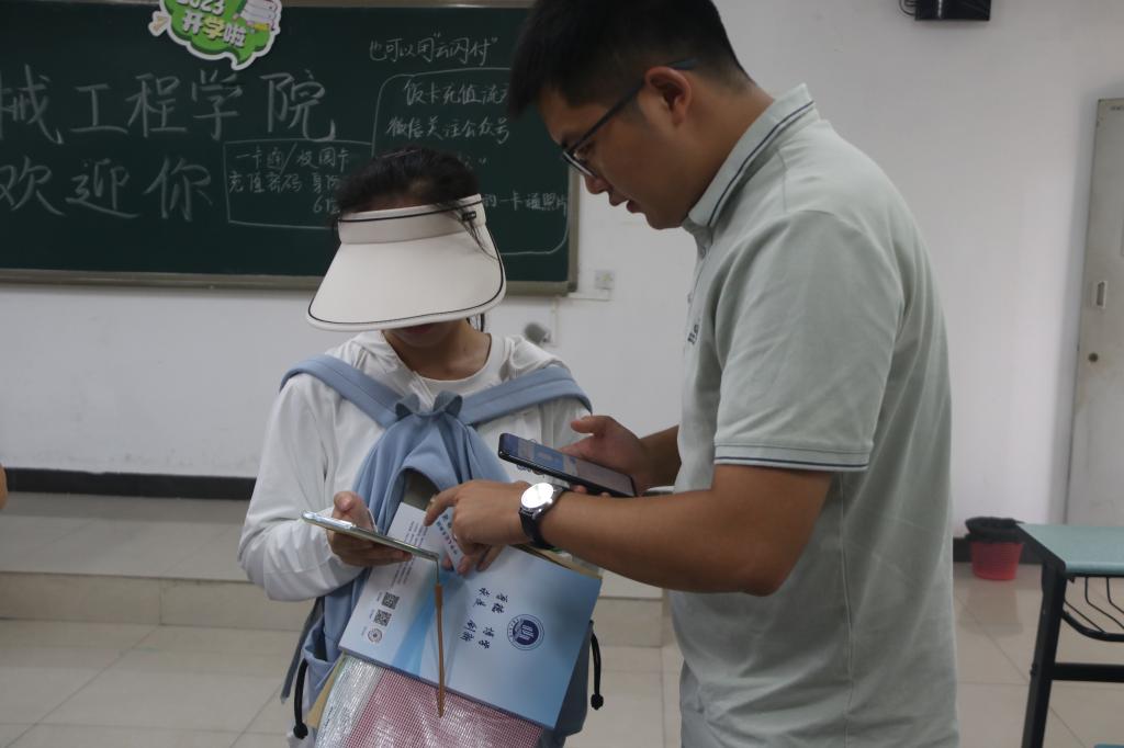 迎新当日,学院领导和老师们早早地来到接待点,等候新同学们的到来。2023级新生辅导员刘静、周委和顾咸霜老师也来到教室报到处,帮助新生完成掌上迎新。