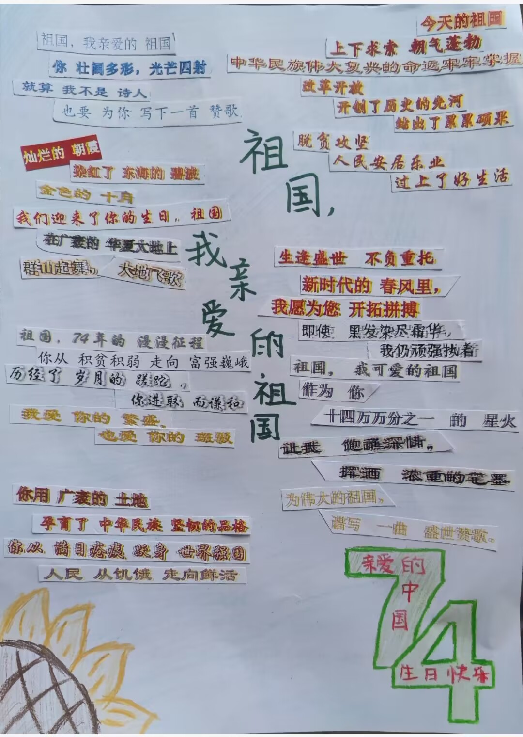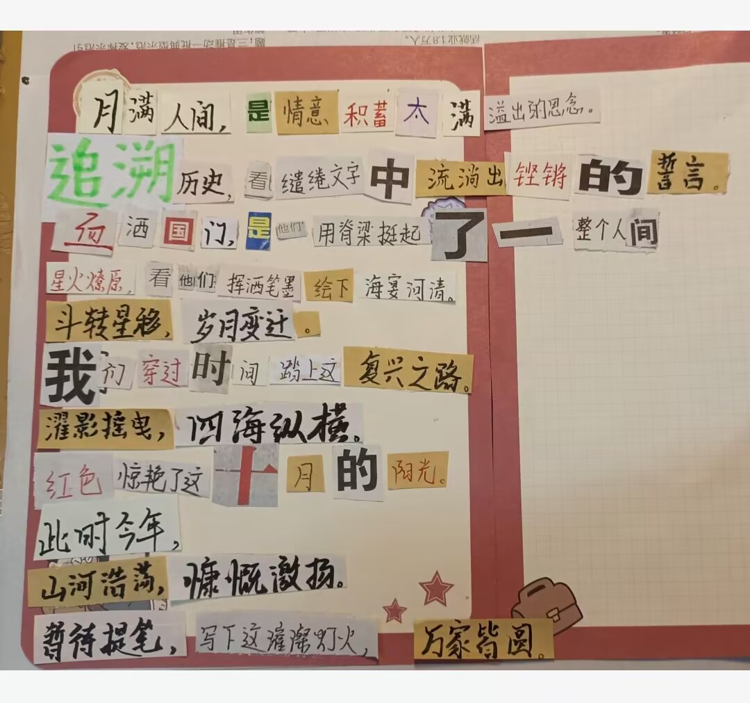 奋斗新天地,逐梦新时代。值此国庆来临之际,必赢线路检测3003no1特开展 “我以点滴颂衷情,我以我心向祖国”拼贴诗活动,鼓励同学发现藏在碎片中的诗意,大胆发挥自己的想象力和创造力,以诗歌来歌颂祖国的伟大新发展,表达自己的赤忱爱国心。以下展示部分优秀作品,献礼祖国母亲74周年华诞。