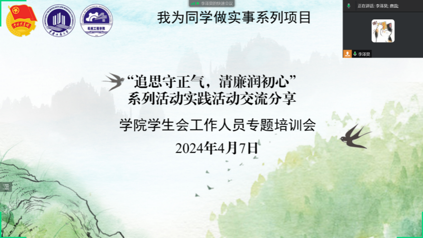 为进一步加强学生会组织规范化建设,提升学生会工作人员的工作技能和服务意识,4月7日晚,必赢线路检测3003no1分团委学生会在线上召开2024年度春季工作人员培训会。会议由组织部负责人朱鹏举主持,分团委学生会全体成员参加会议。