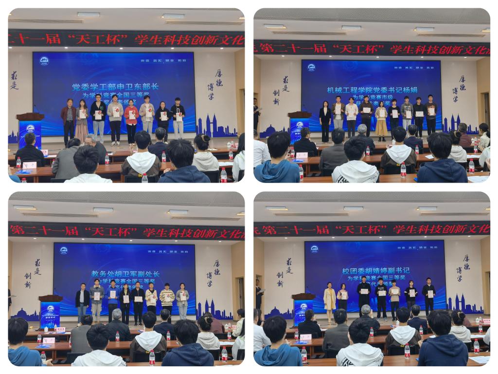学校校长孙芳城教授讲话,他指出,学生科技创新文化活动月搭建了一个很好的竞技和教育的平台,培育出了一大批国赛、省赛获奖作品和选手,以及学生科技团队,在提升同学们创新意识和工程素养上,起到了很好的促进作用。他讲到,在科技发展的大环境下,机械工程学科和技术的重要性、机械工程人才培养的重要性以及实践和创新的重要性,都是学校着重关注的地方。在如今人工智能、数字孪生、智能制造等技术的支持下,机械工程的内涵在不断的拓展和丰富。他相信同学们在面向学科前沿、新的工程领域和重要工程需求时,定会潜心学习和研究,苦练本领,在机械工程科学和技术的发展道路上取得新的突破。