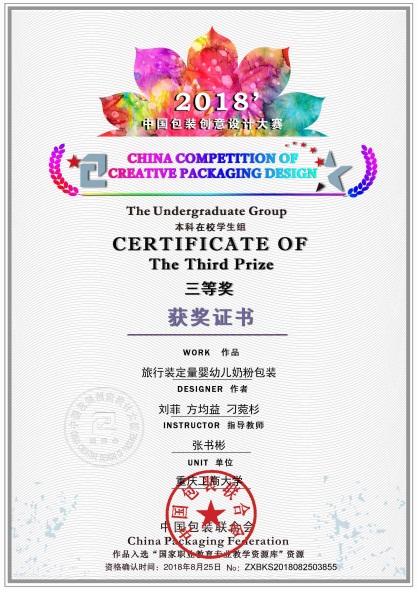 2018年8月,我校学生参加了第八届全国大学生包装结构创新设计大赛和2018中国包装创意设计大赛,获得全国二等奖2项,三等奖4项。