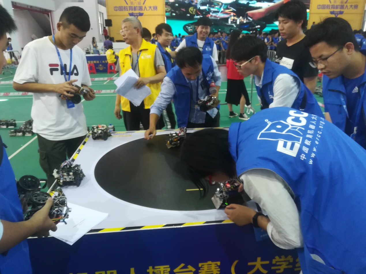 到了正式比赛前一刻,又被裁判告知比赛使用的配重必须是规定零件,但这在规则里面都没有写清楚的,我们为了不被直接判输,又赶紧把至关重要的配重卸掉(机器人只要在规定范围内,越重越有优势,重量相差太大,推不动对手的车,自己反而容易被对方推走。),为了给车子足够的重量,我们把我们所带的所有符合规定的零件(接线、电池、挡板、电阻、插口等等)全部用热熔胶焊上,尽全力抢救。最无奈的是,后来又因为多数队伍都使用了不合规的配重,裁判又说可以使用那些不合规的配重。