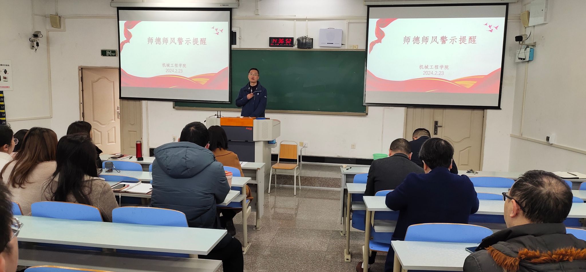 学院院长杜力深入剖析了典型案例,引导全体教职工以案为鉴,以案明纪,进一步强化师德师风底线意识和敬畏意识,积极践行新时代高校教师职业行为十项准则,切实维护教师良好形象,牢记教书育人使命,践行新时代师德规范。