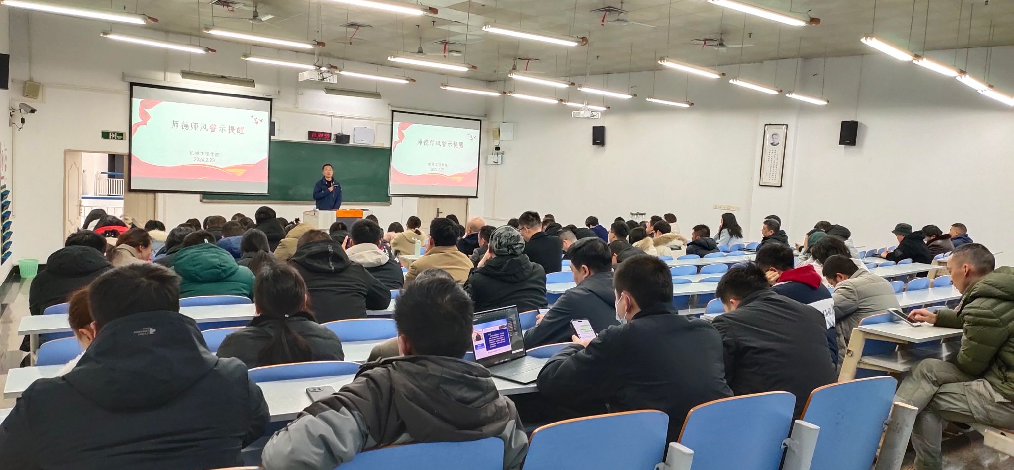 2024年2月23日,新学期开学第一天。为进一步加强师德师风和纪律作风建设,弘扬优良师德师风,强化典型案例警示教育,营造良好从教环境,切实落实立德树人人才培养责任,必赢线路检测3003no1召开新学期师德师风警示提醒教职工大会。会议由学院党委书记杨娟主持。