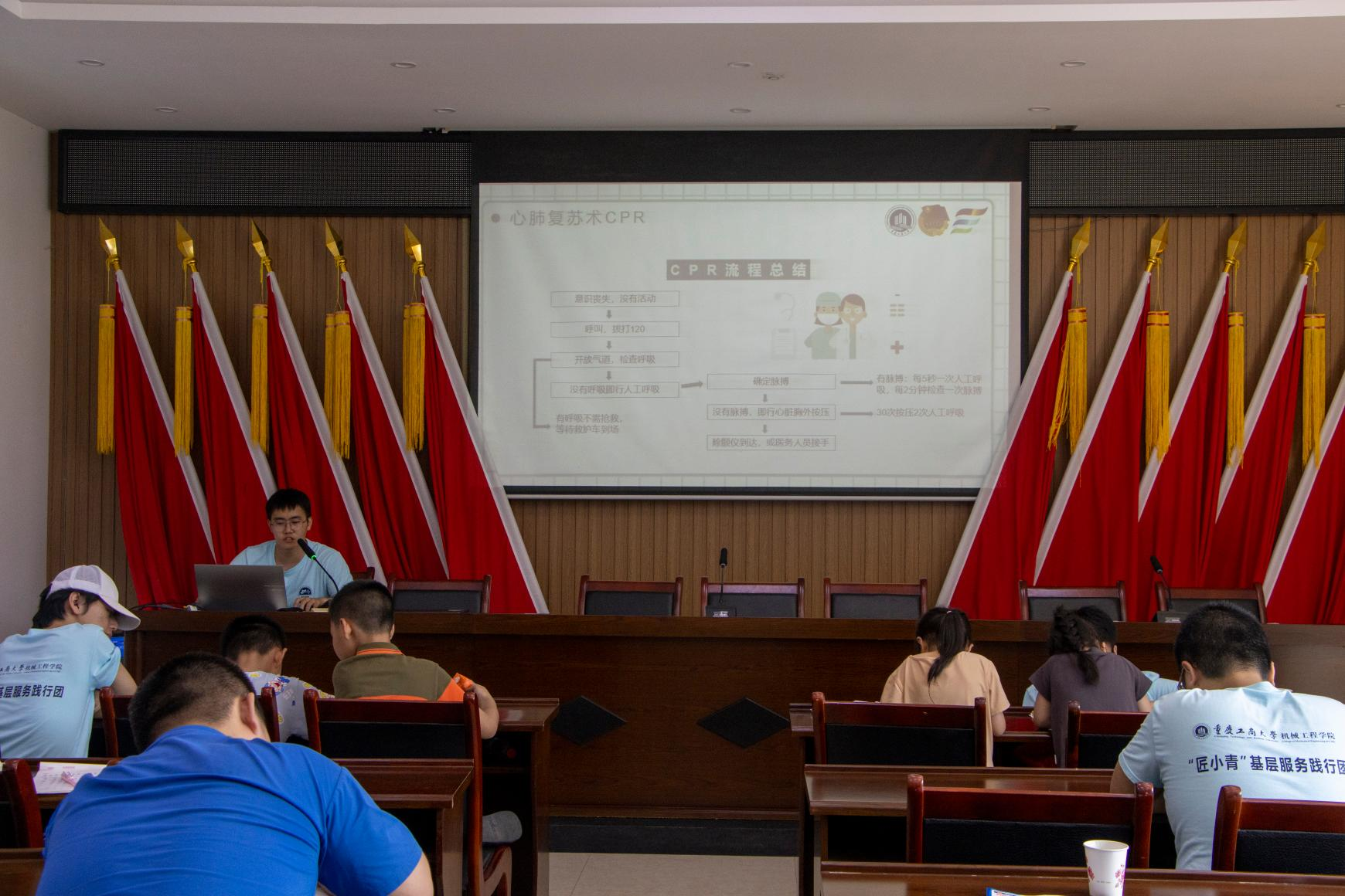 7月16日,必赢线路检测3003no1三下乡“匠小青”社会实践团在万州区大周镇铺垭村组织了一场别开生面的“三下乡”急救知识普及活动。本次活动旨在提高乡村居民的急救意识和技能,为紧急情况下的自救互救提供理论和实践支持。