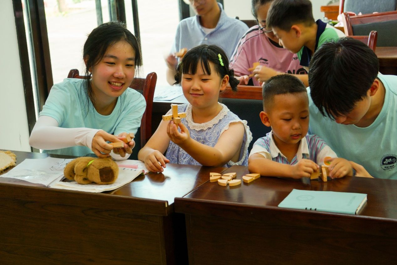 随后,明世成老师引入了鲁班锁这一蕴含古代智慧的传统玩具,并详细介绍了其背后的文化意义与构造原理。为了让青少年们亲身体验鲁班锁的奇妙之处,每位青少年都获得了一个精心准备的鲁班锁。在团队成员的耐心指导和鼓励下,青少年们纷纷动手尝试解开这一古老谜题。经过一番努力,当第一个鲁班锁被成功拆解并重新组装时,现场爆发出阵阵欢呼声和成就感满满的笑容。