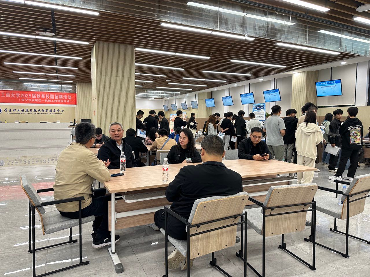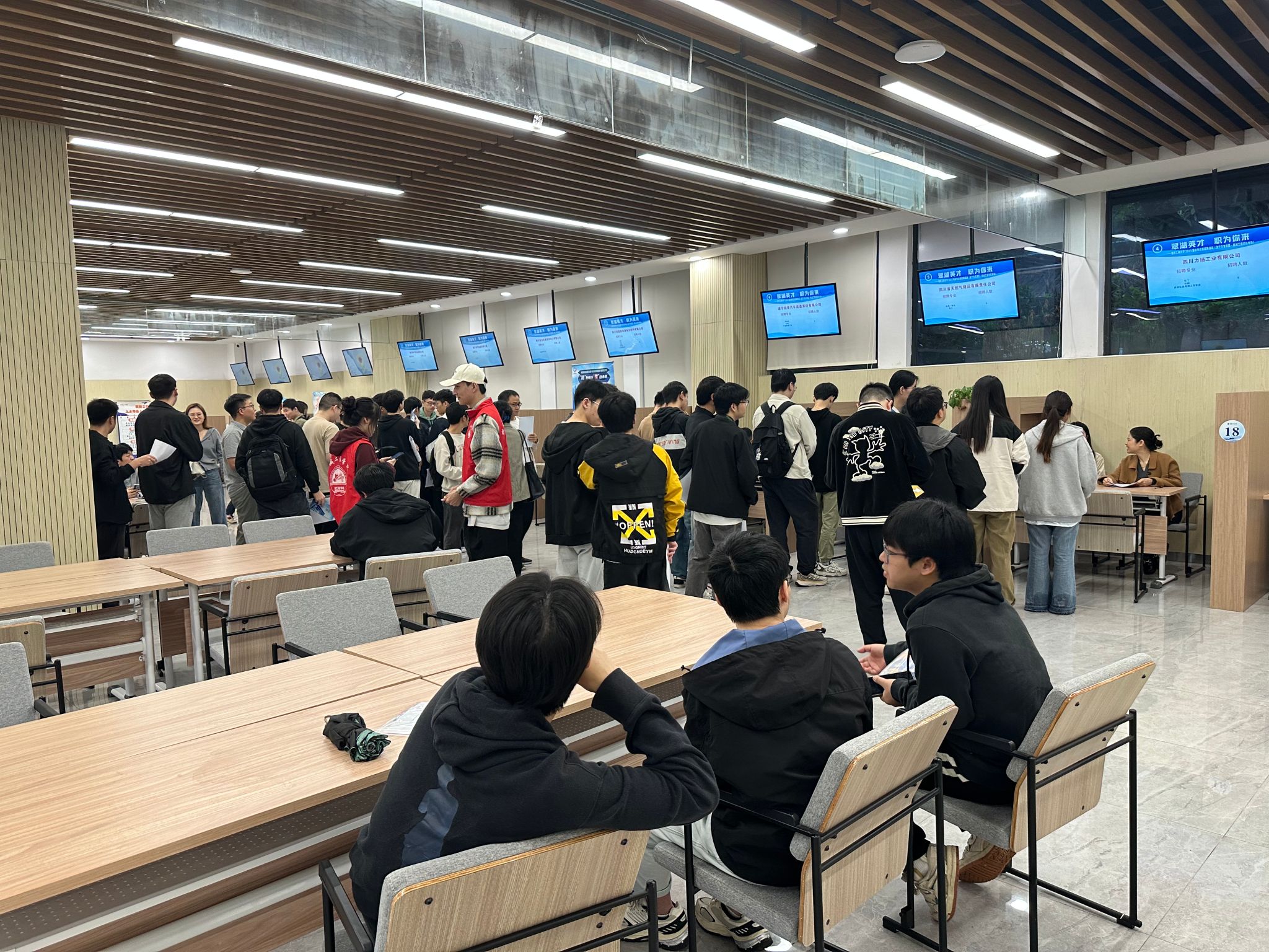 招聘会现场气氛热烈,秩序井然,毕业生积极踊跃前往各展位前查看信息、咨询情况、投递简历,部分单位展位前排起了长龙。学院领导、毕业班