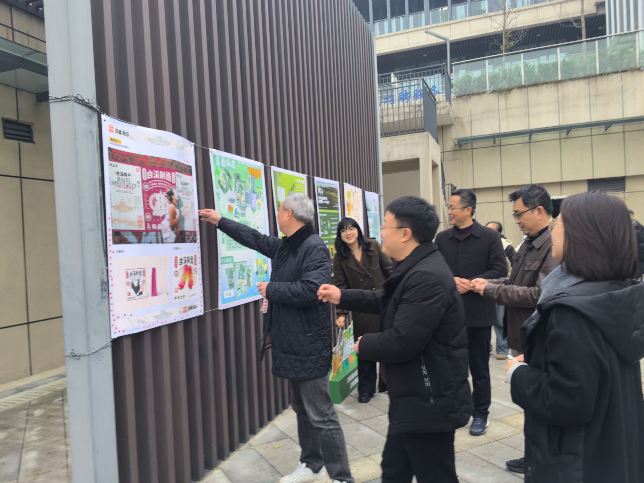 赛场外,选手们精心设计的海报进行分类展示,师生们围观欣赏品评,对构思精巧的作品粘贴喜爱贴,评选“最受欢迎作品奖”, 人群熙熙攘攘,大家兴致勃勃。