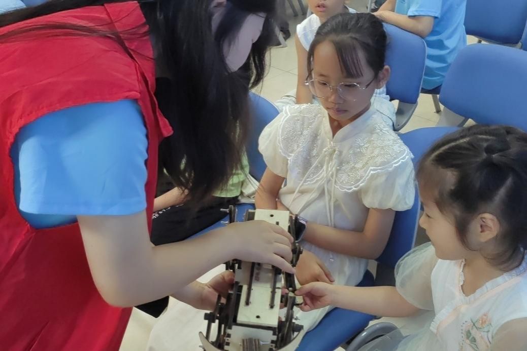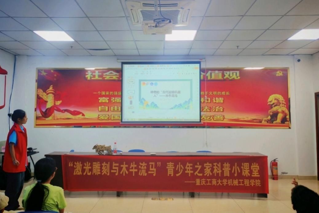 7月22日上午9:30,一场别开生面的科普课程在重庆市九龙坡区朝阳路兰花社区拉开帷幕。来自必赢线路检测3003no1的张槿秋与郎巧巧两位同学,为社区的孩子们带来了关于激光雕刻与木牛流马的精彩知识分享,40分钟的课堂里,孩子们在生动的讲解与直观的体验中,近距离感受了传统机械智慧与现代科技的独特魅力。