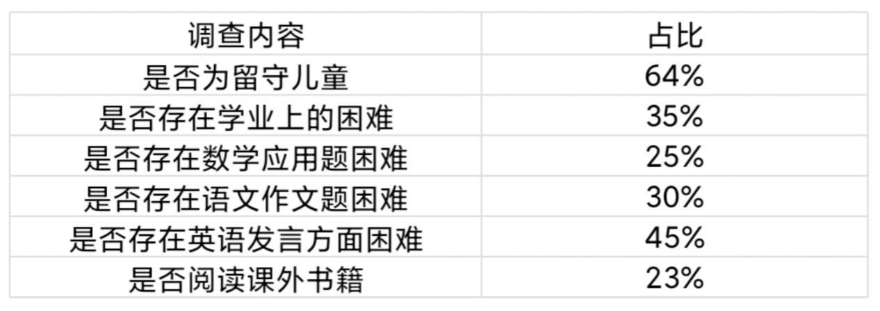 课业辅导活动筹备阶段,后勤保障组成员刘诗泽,陈义雨及宣传摄影组成员宋鹏,周开婧深入当地小学,通过走访的形式,对学生现状进行全面摸底。调研数据显示:当地64%的学生为留守儿童,长期与祖辈生活,存在家庭教育缺失,学习无人监管,遇到问题难以得到解答的问题;35%的学生存在学业上的困难,但大部分学生缺乏自信,不敢主动向老师请教。同时宣传摄影组成员宋鹏还了解到该地区的学生们普遍缺乏课外知识拓展机会,且课外知识的拓展也多显被动,当地村委会设立的图书馆也是无人问津的状态。