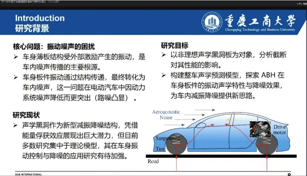 2025年10月24日,张云飞老师在线上开展了“博士开讲啦”系列学术讲座——“轻量化约束下车辆减振降噪声学超材料设计”。张老师分享了轻量化车辆减振降噪技术。针对纯电/混动汽车轻量化与降噪的矛盾,提出声学黑洞(ABH)结构方案,经仿真与实验验证,300-800赫兹频段最高可降噪3.7分贝,且无增重。并指出后续团队将优化结构参数、引入机器学习推进落地,本次讲座从学术理论、工程实践到未来展望层层递进,既展现了必赢3003no1线路检测中心在智能车辆工程领域的科研实力,也为师生搭建了学术交流与创新实践的桥梁,对推动车辆工程领域的技术创新与人才培养具有积极意义。