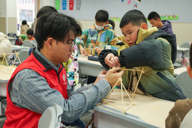 在一年级的“筷子搭桥”科普课堂上,志愿者结合生活实例,用生动通俗的语言向同学们讲解桥梁搭建的基本原理与简单力学知识。课堂上,志愿者指导学生挑选筷子、设计结构、完成拼接,并鼓励大家大胆尝试、积极创新。同学们热情参与,动手实践,在志愿者协助下完成了一座座形态各异、结构稳固的“筷子桥”,并兴奋地展示自己的作品。该课程不仅锻炼了学生的动手能力与空间思维,也让大家在实践中感悟科学与传统的结合。