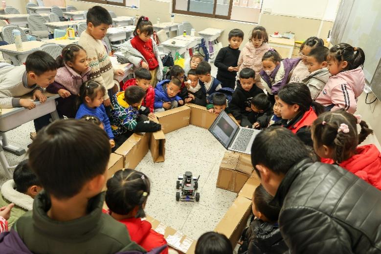 随后的智能ROS小车展演将现场气氛推向高潮。志愿者预先布置好行驶地图,启动小车后,其凭借精准的循迹功能平稳行进、灵活转向,引来同学们阵阵赞叹。大家围聚在地图周围,专注观察小车的一举一动。志愿者借此介绍了ROS小车的工作原理、循迹技术及机械工程相关常识,使学生直观感受到人工智能与机械技术的融合,埋下了探索科技的种子。