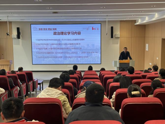 会上,李平院长带领全体教职工集中学习系列重要内容。学习材料包括《习近平总书记在中共中央政治局1月30日会议上的重要讲话精神》《习近平总书记在二十届中央纪委五次全会上的重要讲话精神》《中国共产党第二十届中央纪律检查委员会第五次全体会议公报》《习近平总书记重要文章《在中央城市工作会议上的讲话》(《求是》2026 年第 2 期)》《习近平总书记在中共中央政治局第二十四次集体学习时的重要讲话精神》等。李平要求全体教职工认真学习,筑牢思想根基,坚持学用结合,把理论学习成果转化为推动学院发展、提升育人质量的实际成效。