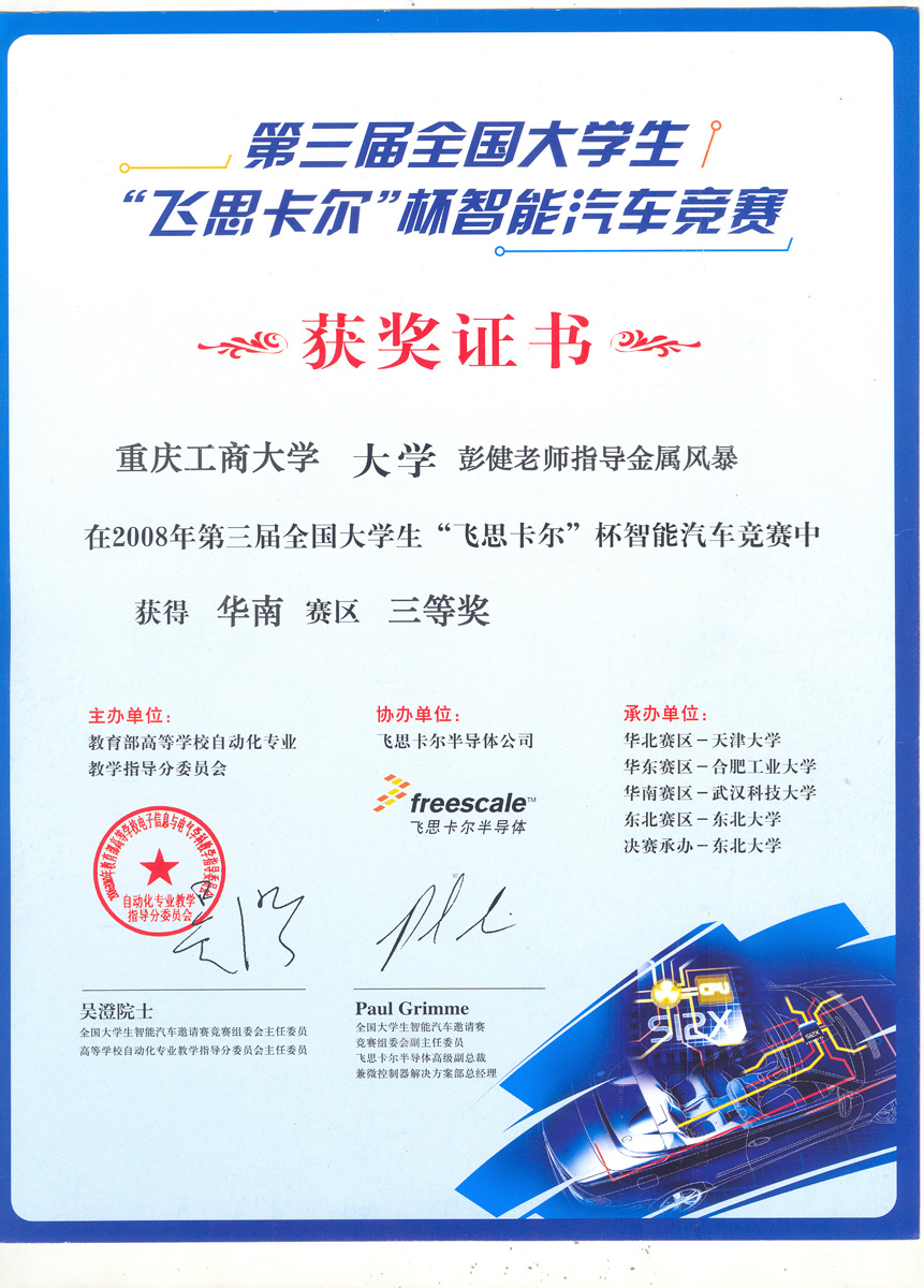 由教育部高等教育司主办的第三届全国大学生“飞思卡尔”杯智能汽车竞赛华南赛区的比赛于2008年7月23日在武汉科技大学体育馆落下帷幕。来自华南及西南地区11个省、自治区、直辖市的47所大学的 146支参赛队伍(光电组72支,摄像头组74支)参加了角逐。必赢3003no1线路检测中心机械与包装工程学院组队参加了此项比赛,并获得华南赛区的三等奖。