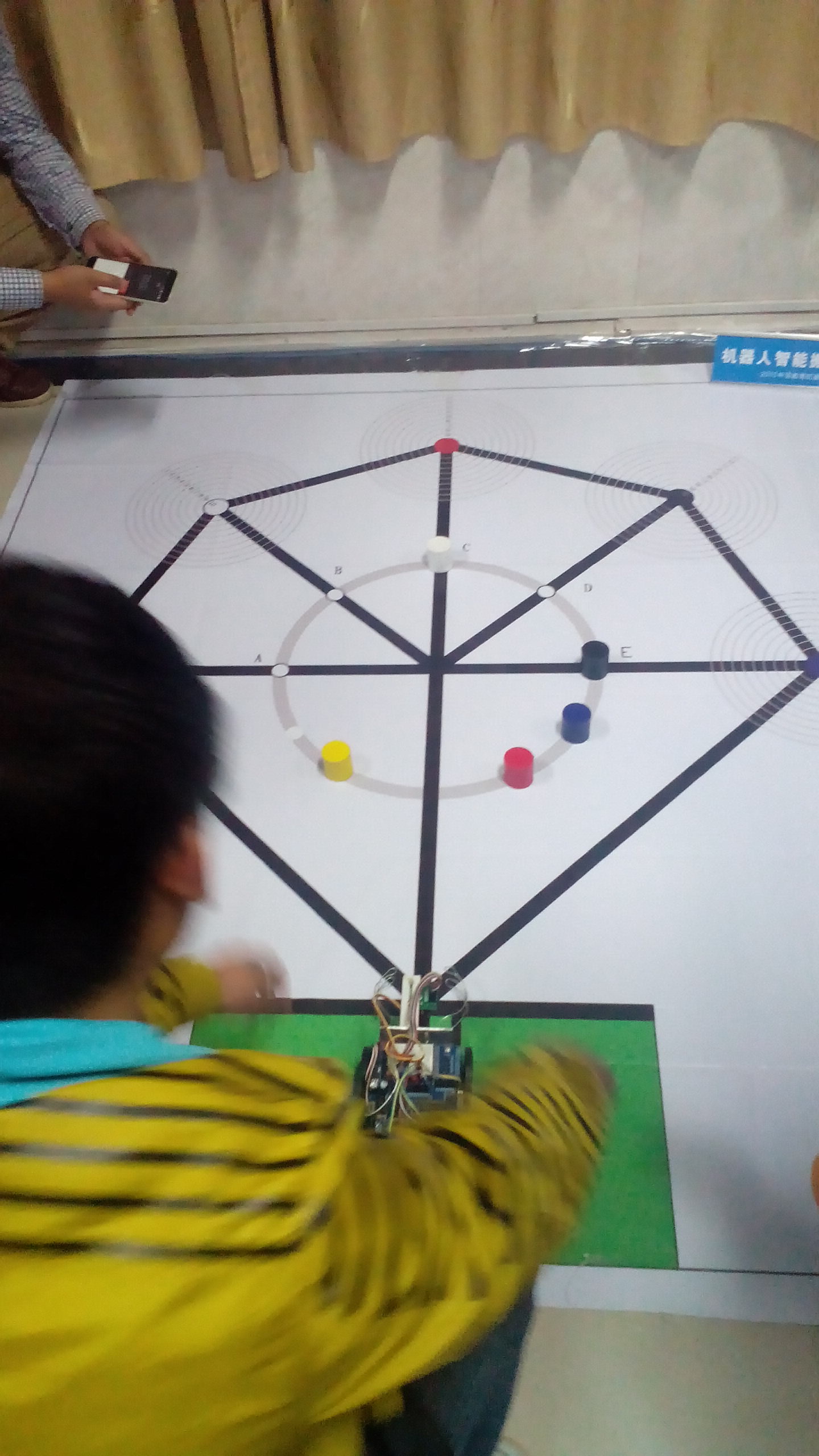 比赛开始,各个学校的参赛选手趁着仅有的时间检查自己的小车接线是否松动,准备背水一战。我们工商大学的选手也不赖,紧锣密鼓准备,面对前面对手的强大压力,临危不惧,并且对各个突变的状况做出灵活果断的决定。当轮到我们学校的选手上场的时候,各个选手雄姿英发,按照平时准备那样启动了小车,当小车缓缓向前驶走,我们的心也跟着小车徐徐前进。当小车停下来时我们心里的大石头才算终于落地。比赛的结果也非常令人振奋,我们学校参加比赛的两个组都分别在各自组别排名第一,获得了机器人游中国特等奖和机器人搬运一等奖。这就意味着我们已经获得参加决赛的资格,也让我们的辛苦努力没有白费。在比赛的闭幕式上,欧鹏工程师黄义勇讲述了目前机器人发展的状况,还有欧鹏的负责人讲述了目前各种机器人在生产方面的应用。在回学校的路上,我们一直欢歌笑语,期待着决赛逐鹿中原。