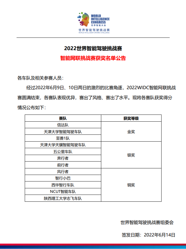 近日,2022世界智能驾驶挑战赛(WIDC)在天津市东丽区举办。世界智能驾驶挑战赛是世界智能大会的重要组成部分,由国家发展和改革委员会、科学技术部、工业和信息化部、国家互联网信息办公室、中国工程院、中国科学院、中国科学技术协会和天津市人民政府共同主办,东丽区人民政府、中国汽车研究中心有限公司、中国生产力促进中心协会、中国人工智能学会智能驾驶专业委员会等专业机构共同承办。本届赛事共吸引了包括清华大学、吉林大学、东南大学、哈尔滨工业大学、天津大学、北京交通大学、极狐、蔚来、理想、小鹏、长安、哈弗等140多所国内外高校和企业参加。