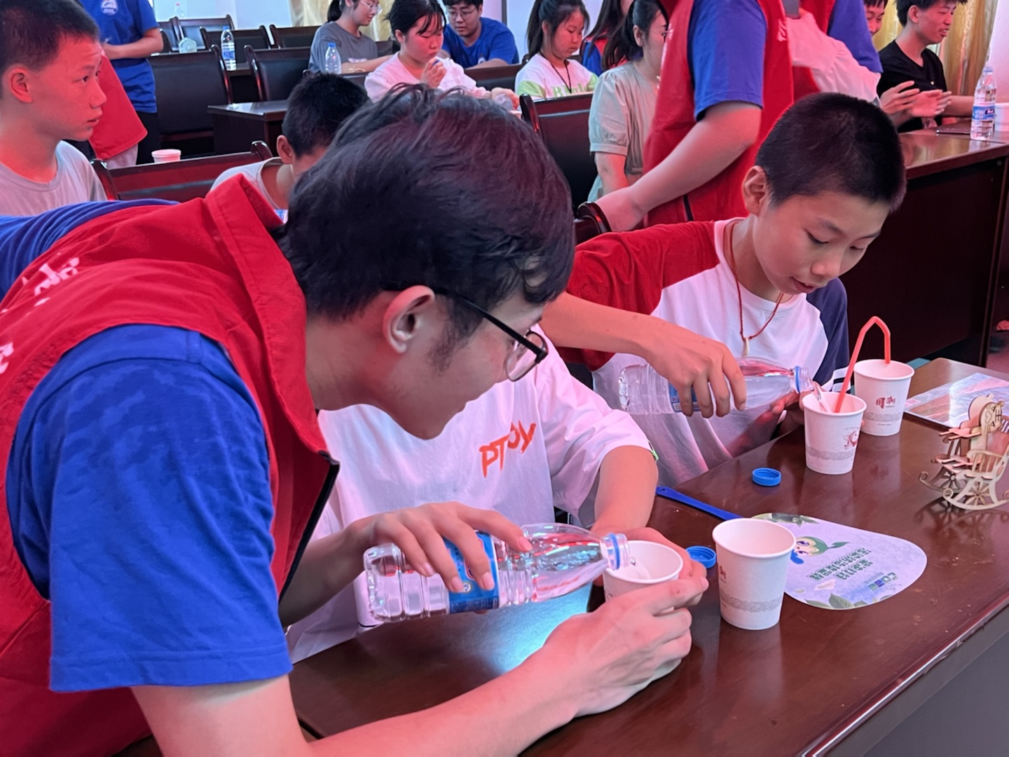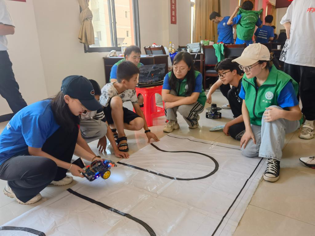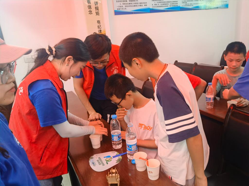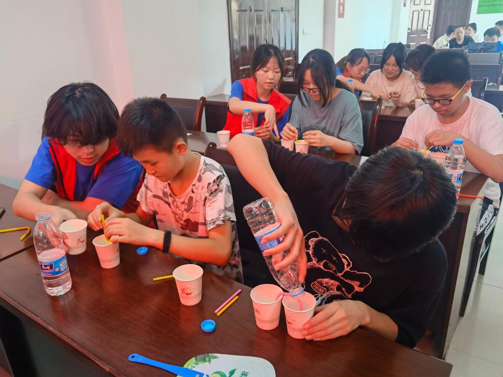 实践团成员们还带领学生们开展了科普小实验——“蓝海沉浮”和“流动的水”。让同学们直观地看到科学的奥秘,学到酸碱中和产生气体的化学知识和U形管“虹吸现象”的物理知识,加深了他们的理解。