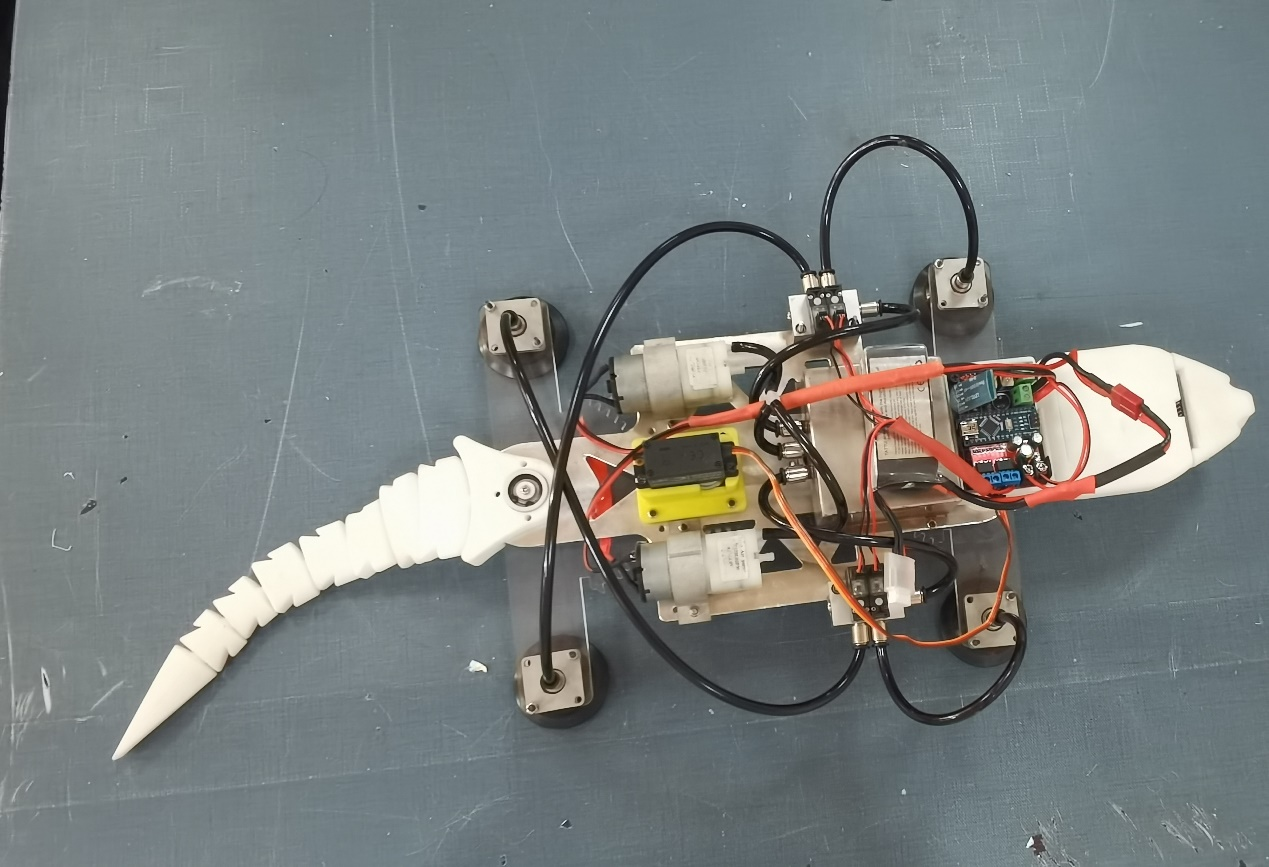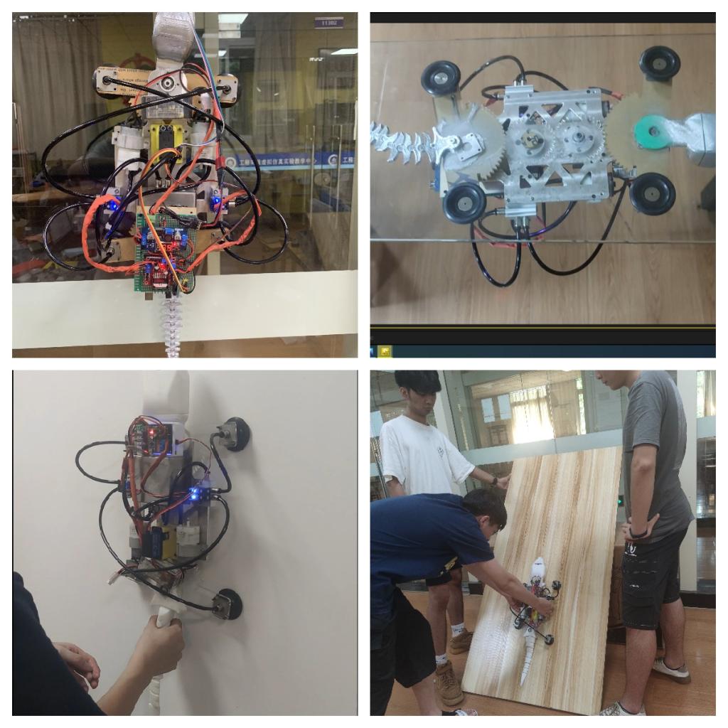 “雄心迈步象牙塔,棋逢对手敢亮剑”。我校参赛作品—仿生壁虎机器人团队的同学们,通过观测与研究壁虎的步态与爬行特点,灵活应用齿轮连杆传动机构创新地设计了单源控制,四足协控的机器壁虎,为了便于吸附墙壁进行爬行,设计了包含微型真空泵、微型电磁阀、真空保护阀、真空储备罐、真空吸盘等部件的真空吸附系统,确保壁虎可以在玻璃或垂直墙壁安全、稳固的爬行。此外,团队的同学们还对仿生壁虎机器人进行了电控系统设计。一方面,利用模块化的概念,对主控板进行了PCB制版设计与加工,强化了其功能模块的快换与扩展功能,同时使电控模块具备了体积小,易安装,高可靠等特点,另一方面,应用C语言对吸附系统、机械传动系统、智慧功能模块进行编程,使得该机器人系统能够安全、稳定地完成垂直墙面爬行(玻璃墙体、建筑外墙、室内墙体等)、转弯、避障,陡坡爬行与避障、远程控制等多种功能,可用于民用外侧高墙及玻璃墙体的清洁,以及桥隧高壁的结构检测等任务。