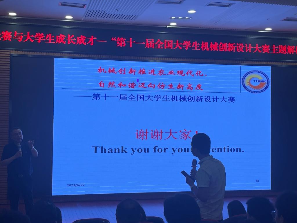 李平副院长对报告会做了总结,并感谢王晶教授为我院师生在赛事解读以及主题选取上给出思路和建议。杜力院长希望各位指导教师和参赛同学根据王晶教授的讲解,准确把握大赛主题,设计出优秀的作品,在第十一届大学生机械设计创新大赛再创佳绩。